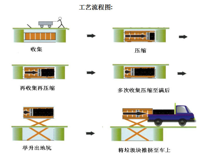 1.主要特點 ◇平穩(wěn)可靠:兩側舉升,剪叉跨度大,升降平穩(wěn),無傾斜; ◇淺地坑:地坑深度僅為1.55m,保潔及維修極為方便; ◇高效率:壓實每噸垃圾時間≤10min; ◇全封閉水平壓縮:采用水平壓縮方式,垃圾壓縮密度≥0.86t/m3,垃圾壓縮后體積大大減小,從而大幅度提高轉運車輛裝載量和轉運效率,降低垃圾處理、轉運等費用; ◇動作少,故障率低,整套設備的垃圾壓縮、裝車由三個動作完成,簡單實用,各動作之間安全互鎖,防止操作人員誤操作造成安全事故,安全可靠; ◇垃圾儲存、壓縮及寄存全部在地面以下,地面上沒有垃圾散落,對環(huán)境影響較小,環(huán)保性好;垃圾壓縮后密度高,水份少,可避免汽車運輸中的垃圾散落、污水滴漏現(xiàn)象,避免二次污染; ◇土建費用低,占地面積小,可以不蓋大型工作間,既節(jié)約了投資,也縮短了工期; ◇留有專門的維修窗口,維修保養(yǎng)方便; ◇設有固定式操作和遙控器兩種操作模式,方便實用; ◇自動化程度高,可大幅提高工作效率,降低勞動強度。